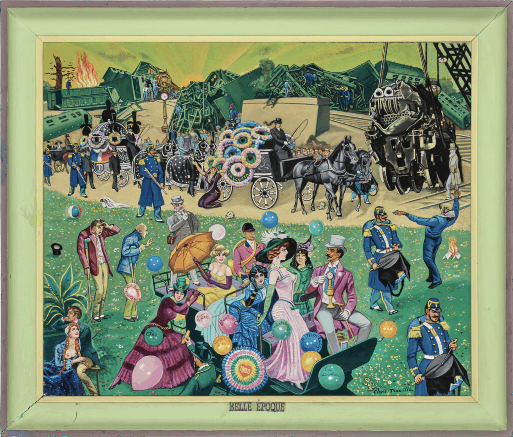 signed ‘Clovis Trouille’ (lower right); inscribed ‘BELLE ÉPOQUE’ (on a label lower centre on the artist’s frame);signed and inscribed ‘Clovis Trouille 57 Avenue Mathurin Moreau Paris 19è’ (on the reverse); inscribed ‘le beau désir’ (on the stretcher)
