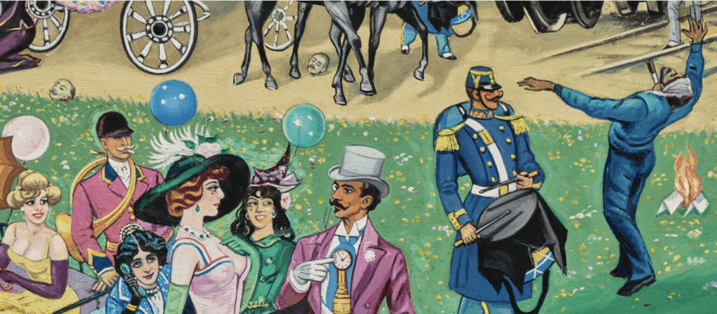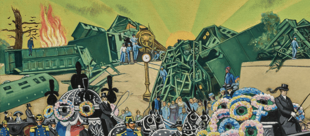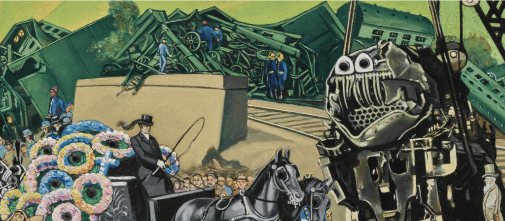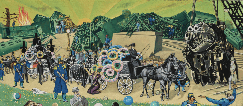 « Des fêtards sont venus voir l’enterrement des victimes d’une catastrophe de chemin de fer. Ça leur donne des désirs érotiques (comme quand ils allaient voir des exécutions capitales). Ces fêtards sont des célébrités de l’époque dont les noms sont inscrits sur les ballons. »